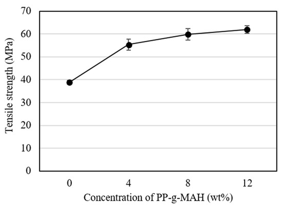 Figure 4, which exhibits the results of employing various concentrations of PP-g-MAH, depicts the tensile strength of LFTPc. The results indicate that an increase in the amount of PP-g-MAH correlates with a related increase in the tensile strength. At PP-g-MAH concentrations of 0, 4, 8, and 12 wt%, the tensile strength values for the LFTPc were 38.92, 55.37, 59.84, and 61.98 MPa, respectively. The LFTPc with a 12 wt% PP-g-MAH component exhibited a tensile strength increase of approximately 59.24% compared to LFTPc devoid of PP-g-MAH.