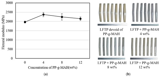 Correlation between (a) flexural modulus and the concentration of PP-g-MAH in LFTPc and (b) testing specimens.