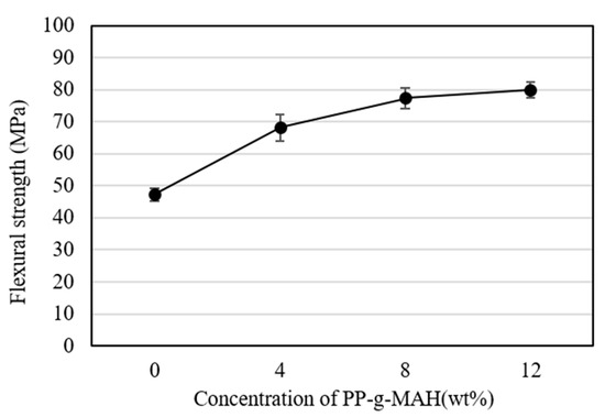 Figure 6 presents an illustration of the flexural strength values of the LFTPc using various concentrations of PP-g-MAH. The results indicate that the flexural strength exhibited an increase in correlation with the concentration of PP-g-MAH. The respective flexural strengths of the LFTPc were obtained at 47.27, 68.16, 77.35 and 80.02 MPa, when the concentrations of PP-g-MAH were 0, 4, 8, and 12 wt%. The LFTPc containing 12 wt% PP-g-MAH demonstrated the maximum flexural strength values, an increase of approximately 69.66% in comparison to the LFTPc devoid of PP-g-MAH.