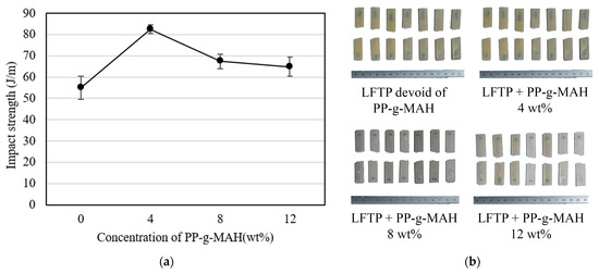 Correlation between (a) impact strength and the concentration of PP-g-MAH in LFTPc and (b) testing specimens.