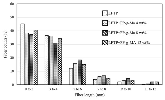 The fiber length of GF decreased during the injection molding process due to the screw, cylinder, nozzle, and runner [35]. Figure 8 shows the residual fiber length of LFTPc with varying concentrations of PP-g-MAH. The results indicate that the fiber length of GF is distributed across the entire range, from 0.1 to 12 mm. The fiber length ranging from 0 to 2 mm exhibited the highest values, while the range of fiber length from 3 to 4 mm showed a decrease of only 5–15%. This finding suggests that LFTPc is reinforced by long fibers. Additionally, the percentage of fiber length in the range of 5 to 6 mm was 9–18%, providing clear evidence of reinforcement by long fibers. This is supported by the fact that short fiber-reinforced composites typically have fiber lengths in the range of 0.1–0.5 mm. [18]. This evidence confirms the reinforcement by long fibers.