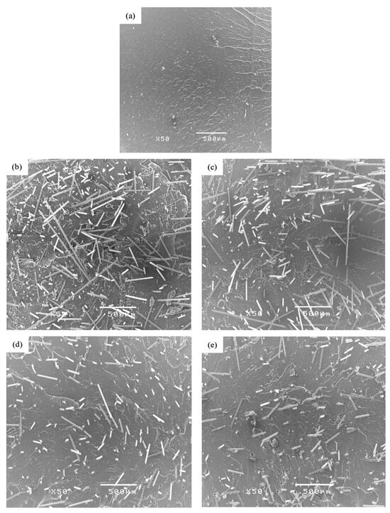 SEM micrographs at a magnification of 50× of (a) virgin PP, (b) LFTP devoid of PP-g-MAH, (c) LFTP with PP-g-MAH of 4 wt%, (d) LFTP with PP-g-MAH of 8 wt%, and (e) LFTP with PP-g-MAH of 12 wt%.