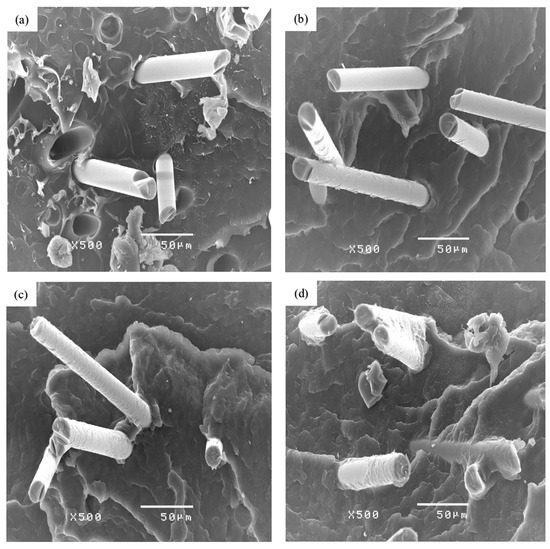 Specimens were examined using SEM after the Izod impact test to investigate the surface morphology of the LFTPc with varying concentrations of PP-g-MAH, and the findings are shown in Figure 9. It was evident that the LFTPc’s pull-out of GF and the spaces between them and PP was improved by the incorporation of PP-g-MAH. Figure 9b–e illustrates that the pull-out of fibers decreased as the concentration of PP-g-MAH increased. Consequently, the fiber pull-out and the interface between GF and PP were effectively improved by PP-g-MAH. Additionally, SEM images of the LFTPc containing varying concentrations of PP-g-MAH are displayed in Figure 10 at a 500× magnification. It was evident that as the amount of PP-g-MAH increased, the interstices between the GF and PP decreased. Furthermore, the incorporation of PP-g-MAH to the GF surface of the LFTPc resulted in an appearance of cohesive resin, which indicated a great interface between the GF and resin. Consequently, an improvement in the GF-PP interface and pull-out of fibers leads to an increase in mechanical characteristics. The images of the LFTPc with varying concentrations of PP-g-MAH corresponded with the literature review [27,36,40]. It effectively communicates that the mechanical properties of LFTPc were enhanced through the enhancement of interfacial adhesion between GF and PP, a result of the incorporation of PP-g-MAH.