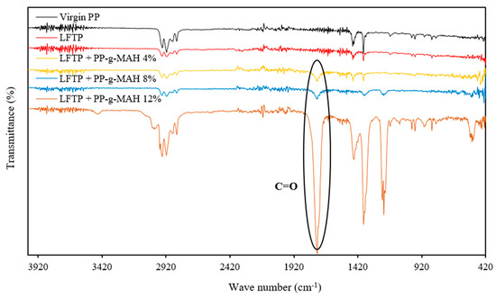 The spectra of virgin PP and the LFTPc with a varying PP-g-MAH content were examined at wave numbers ranging between 4000 and 400 cm−1; these spectra are displayed in Figure 11. The FTIR spectra exhibit consistent peaks at 2949 and 2915 cm−1, corresponding to aliphatic C-H stretching, and at 1457 and 1375 cm−1, indicating C-H bending, which, respectively, demonstrate the presence of PP in the LFTPc [34,42,43,44]. The carbonyl group (C=O) of the anhydride and the acid groups, respectively, is represented by peaks at 1740 and 1714 cm−1 in the FTIR spectra of the LFTPc with varying concentrations of PP-g-MAH [44,45,46]. It is confirmed that maleic anhydride is present in the LFTPc containing PP-g-MAH. Therefore, the presence of PP-g-MAH in LFTPc improved interfacial adhesion, as observed in SEM micrographs. This effect was explained by Tselios et al. [47], with the reaction of MAH groups of PP-g-MAH with the hydroxyl groups of GF. The generated carboxylic groups have the ability to form hydrogen bonds with the hydroxyl groups on GF.