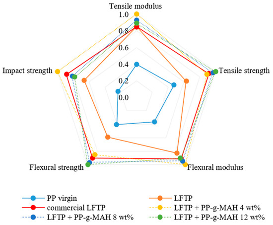 The mechanical properties were conducted to compare with commercial LFTP at the same volume fraction of GF, which is 15 wt%, as depicted in Figure 12. The results clearly demonstrate that the mechanical properties of the LFTPc were better with the addition of PP-g-MAH. There was an approximate increase of 4.44–17.44% in the tensile modulus values, 42.25–59.26% in the tensile strength values, 9.07–20.72% in the flexural modulus values, 44.19–69.29% in the flexural strength values, and 18.16–50.33% in the impact property data. While the addition of PP-g-MAH into LFTP led to positive mechanical properties, exceeding the limit of PP-g-MAH addition will result in a reduction in impact strength, tensile modulus, and flexural modulus. Furthermore, the cost of PP-g-MAH incorporation into LFTPcs is taken into consideration. In comparison to the commercial LFTP product, the mechanical properties of the LFTPc devoid of PP-g-MAH have been found to be inferior. All mechanical property values in the LFTPc increased to levels that were comparable to commercial LFTP after PP-g-MAH was incorporated. The LFTPc containing filled PP-g-MAH component had a slightly greater tensile modulus, tensile strength, and flexural modulus values than commercial LFTP, by approximately 1–16.76%. The flexural strength values of the LFTPc incorporating PP-g-MAH content of 8 and 12 wt% were slightly higher than those of commercial LFTP, by approximately 7.17–10.87%. The impact strength values of the LFTPc containing a 4 wt% PP-g-MAH content were slightly greater compared to those of commercial LFTP by approximately 12.36%. Therefore, the LFTPc incorporated with a concentration of 4 wt% PP-g-MAH was considered optimal for manufacturing LFTP, as it exhibits nearly equivalent or higher mechanical properties compared to commercial LFTP. Although the flexural strength value was lower than those of commercial LFTP, it was only 5.57%.
