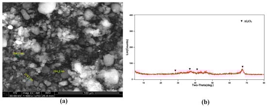 In the experimental study, AA5754 aluminum alloy, obtained from the local market, was utilized as the primary matrix material, with a thickness of 3 mm. The chemical composition of the AA5754 alloy was determined based on the provided data sheets, detailed in Table 1. To facilitate experimentation, the aluminum matrix was meticulously cut into rectangular pieces, measuring 160 × 200 mm, employing a hydraulic shearing machine. The mechanical property data collected in the laboratory setting are presented in Table 2 for comprehensive analysis. To enhance the properties of the alloy, Al2O3 nanoparticles were meticulously selected as additives to fabricate a nanocomposite material. The average particle size of the Al2O3 was determined to be 1000 nm, accounting for any potential agglomeration effects. The morphology of the utilized particles is depicted in Figure 1a via scanning electron microscope (SEM) imaging, while the X-ray diffraction analysis (XRD) results are elucidated in Figure 1b for further characterization.