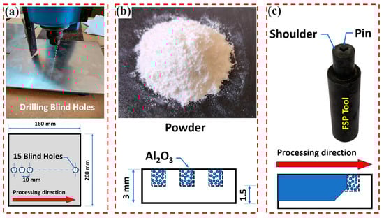 (a) Drilling holes on aluminum matrix, (b) Al2O3 powder placements in aluminum matrix, and (c) used FSP tool.