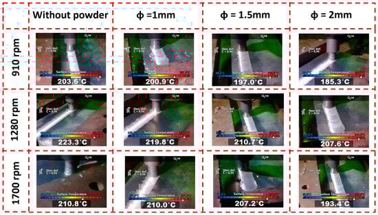 The thermal history analysis revealed significant insights into the relationship between the FSP parameters and the heat generation in the aluminum alloy matrix infused with Al2O3 nanoparticles []. Through thermo-visual camera observations, as shown in Figure 3, alterations in surface heat flux during the process were monitored along the welding line.