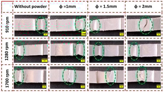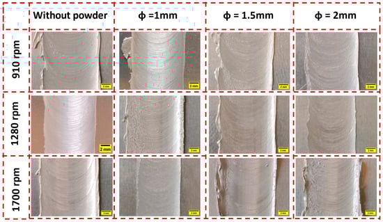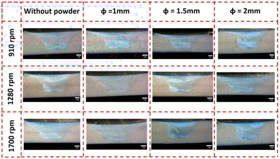 The evaluation of sample surfaces constituted a pivotal aspect of this study, providing crucial insights into the effects of FSP conditions and the incorporation of nanopowder on surface characteristics []. Optical images of all the samples were meticulously examined, offering visual representations of surface features as depicted in Figure 5. Analysis of surface characteristics was conducted across two distinct groups. First, the FSP conditions without nanopowder, and second, those with nanopowder. The results revealed a general absence of macroscopic defects or significant imperfections on the surfaces of the FSP samples. However, a prevalent surface anomaly identified as surface flash was observed in the proximity of the samples, particularly evident on the retreating side. The absence of substantial defects underscores the effectiveness of the FSP process in producing high-quality surfaces in both nanopowder-infused and non-infused scenarios. While surface flash emerged as the primary surface irregularity, its presence was localized and did not compromise the overall integrity of the samples. This analysis underscores the importance of surface examination in assessing the quality and reliability of FSP-produced components.