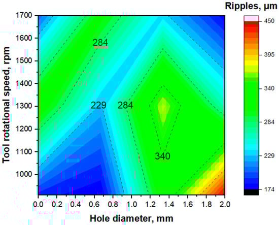 The surface analysis yielded critical insights into the characteristics of the sample surface flow, particularly focusing on the observation of surface flow rings, commonly referred to as ripples. The relationship between the distance between these ripples and both tool rotational velocity and hole diameter was systematically investigated and is graphically depicted in Figure 6. It is conceivable to establish a correlation between the ripple distance, measured in micrometers, and the diameter of the holes, which serves as an indicator of the quantity of Al2O3 nanopowder dispersed within the aluminum matrix, as well as the rotational velocity of the FSP tool, expressed in revolutions per minute (rpm).