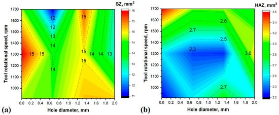 Relation between tool rotational speed and hole diameter with (a) SZ and (b) HAZ of samples.