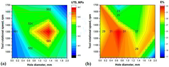 Relation between tool rotational speed and hole diameter with (a) UTS and (b) elongation of samples.