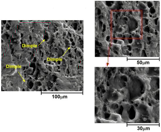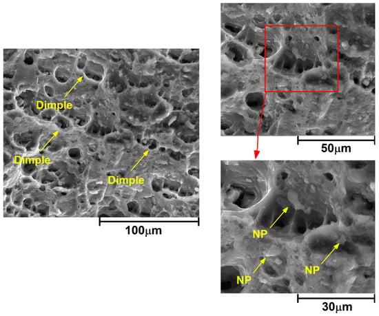 The examination of the fracture surfaces using SEM provided valuable insights into the failure mechanisms and microstructural features of the produced nanocomposite samples, particularly sample C3, which exhibited the lowest UTS, and sample B2, which demonstrated the highest UTS. The SEM images from the fracture surface of sample C3 after the tensile test, as presented in Figure 11, revealed both low-magnification and high-magnification views. The low-magnification images provided an overview of the fracture surface, while the high-magnification images offered detailed insights into the microstructural features. Very small dimples with an irregular pattern observed on the fracture surface indicated a ductile fracture type, suggesting plastic deformation and energy absorption during the failure process. Moreover, high-magnification SEM images revealed the presence of agglomerated Al2O3 nanoparticles inside the dimples, indicating strong bonding between the nanoparticles and the aluminum alloy matrix. The presence of these agglomerated nanoparticles suggests that they may have served as crack initiation sites during the tensile test, influencing the fracture behavior and mechanical properties of the nanocomposite. Specifically, the agglomeration of nanoparticles may have compromised the uniform distribution of reinforcement within the matrix, leading to localized stress concentrations and reduced tensile strength. The observed agglomeration of Al2O3 nanoparticles at the interface of dimples may be attributed to the high rotational velocity during the friction stir processing, which promotes intense stirring action of the aluminum matrix and nanoparticles. Instead of uniformly dispersing throughout the stir zone, the nanoparticles agglomerated, potentially diminishing the effectiveness of reinforcement and adversely affecting the mechanical properties of the produced nanocomposite.