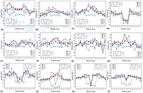 Hardness profile of samples (a) A0, (b) A1, (c) A2, (d) A3, (e) B0, (f) B1, (g) B2, (h) B3, (i) C0, (j) C1, (k) C2, and (l) C3.