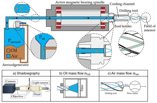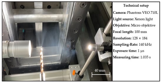 Figure 2. A high-speed camera and a light source are positioned collinearly opposite to each other, with the MWF to be examined (oil mist) between them. With the MQL supply, high exit rates of the oil mist from the cooling channel are to be expected due to the assumed high air velocities above 200 m/s. Thus, a high-speed camera needs to be used (Phantom VEO 710L (Vision Research Ltd.-UK, Leicester, UK), recording rate 140 kHz). In addition, a micro lens is utilized due to the cooling channel diameters of only 0.8 mm and 1 mm of the drilling tools examined (