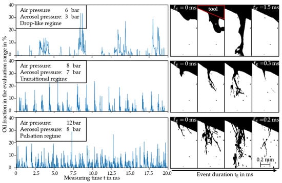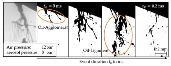 Figure 4). As with the evaluation area, this records black pixels. Evaluation at this line is carried out during the provisional event duration, i.e., from the start to the end of the event. This confirms the existence of the event. This condition is necessary because, particularly at low pressures of the aerosol generator, oil accumulates at the outlet of the cooling channels, which increases in size over time in the form of large drops and moves strongly in the image section before the separation process. As a result, the movement in this area may be incorrectly evaluated as one or even several events. Based on the detected events with the starts and ends of the associated event, the event durations and periods were determined. The following relationship was used to determine the event frequency from the event periods.