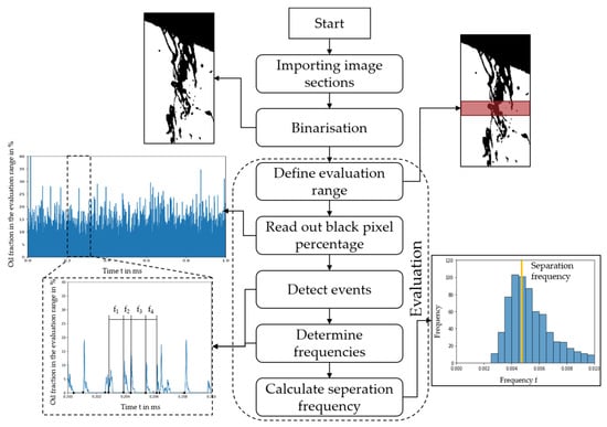 Figure 4 shows a simplified programme flow chart of the evaluation unit developed in this work for detecting the events and calculating the separation frequency. The image series resulting from the shadow impact method are read in image by image by the evaluation unit. The 8-bit images are binarized using a suitable threshold value of 128 to ensure a clear distinction between the oil and the environment. As a result of the binarization, the oil in the image was displayed in black (value of 0) and the surroundings in white (value of 255). Based on this, a fixed rectangular evaluation area has been defined to detect the events where each black pixel is counted. This procedure allows to determine the proportion of black pixels in the evaluation area. If the proportion of black pixels in the evaluation area exceeds 1%, this is a preliminary event. Below this threshold, it could be oil residue from a previous event that is delayed in moving through the evaluation area. In addition, a further condition was implemented to ensure that it was actually an event. For this purpose, an evaluation line was defined at the bottom edge of the image section (see