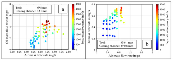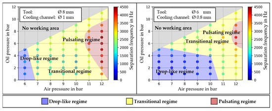 The influence of the pressures on the separation frequency is also evident. It increases with increasing air pressure. As with the oil mass flow, the aerosol pressure shows a downward parabolic curve from an air pressure of 8 bar. The separation frequency also reaches a maximum at an air pressure of 12 bar and an oil pressure of 6 bar. When transferring the air and oil mass flows in relation to the separation frequency, it can be seen that an increase in the mass flows leads to an increase in the separation frequency. Furthermore, flow regimes can be represented based on the separation frequencies, each of which has a characteristic exit behaviour of the oil from the cooling channels.