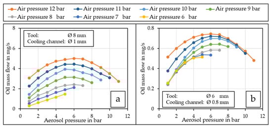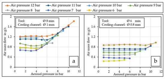 The main adjustable process variables (air and aerosol pressure) at the aerosol generator were varied in a full factorial design of experiments to analyse their influence on the flow of the MQL at the outlet of the cooling channels. The air pressure has been varied from 6 bar to 12 bar, and the aerosol pressure ranges from 5 bar to 11 bar. The selected parameter ranges allow for an effective operation of the aerosol generator taking into account the condition that the pressure difference must not be less than 1 bar.