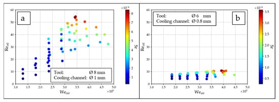 In addition to the influence of the air and oil mass flows on the MQL supply, the effects of different tools and, therefore, different cooling channel diameters were investigated. Due to the dependence of the outer tool diameters on the cooling channel diameters, the relevant geometric information on the two drilling tools used is shown in