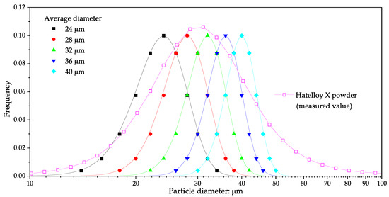 A Ni-based alloy, Hastelloy X, was used in this study. The chemical compositions of both the bare plate and the Hastelloy X powder are listed in Table 1. The particle size distribution of the Ni-based alloy (Hastelloy X) powder used in this study is shown in Figure 1. The average particle diameter of Hastelloy X powder was 28.9 m [10,40]. To investigate the effect of particle size within a range similar to that of the Hastelloy X powder used in this study, five different particle size distributions based on Gaussian distributions were used. The average particle diameters () of the five distributions were 24, 28, 32, 36 and 40 m, respectively. The Gaussian distribution is expressed as follows: