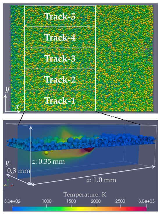 The DEM result with a packing fraction closest to the average packing fraction of the five simulations was selected from the five DEM simulation results with different initial particle configurations. Figure 3 shows a top view (x-y plane) of the final particle configuration obtained from the powder spreading simulation for = 24 m. Considering the effect of the particle configuration on the results of the multiphysics CFD simulation, a section of the powder bed was partitioned into five regions, as shown in Figure 3. Each partitioned region had a width of 1.0 mm and a depth of 0.3 mm. The five L-PBF simulations were performed using each of the five partitioned regions. As shown in Figure 3, the simulation model had a width of 1.0 mm, a depth of 0.3 mm, and a thickness of 0.35 mm. A hexagonal mesh with a grid size of 5 m was used. For high computational accuracy, the grid size was changed to 2.5 m for the powder bed region and the upper part of the substrate with a thickness of 120 m (200 m thickness in total). A VOF (F) value of 1 was set for the powder bed and substrate regions as the initial condition. The initial temperature of the whole simulation model was set to a typical room temperature of 298.15 K.