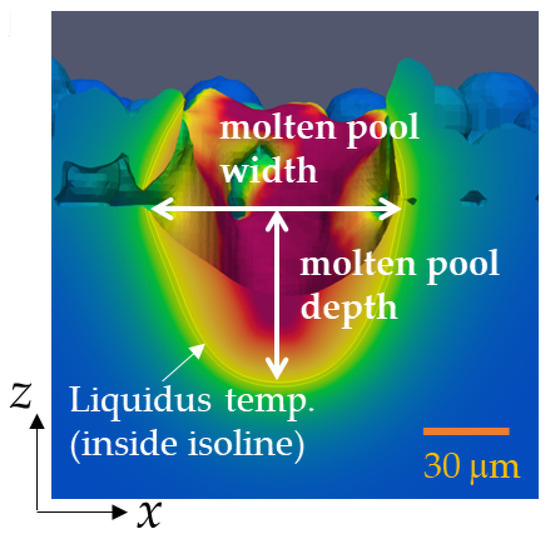 Figure 4 shows a typical cross-section obtained from the multiphysics CFD simulation. The figure represents the y-z plane at the centre of the laser displacement (x = 0.5 mm). The white lines in the figure represent the isolines of the solidus and liquidus temperatures, respectively. The molten pool width was determined as the distance along the y direction between the maximum and minimum positions of the isoline of the liquidus temperature at the top of the substrate (z = 0.17 mm). The molten pool depth was determined as the distance along the z direction from the top of the substrate to the minimum position of the isoline of liquidus temperature.