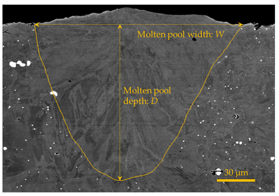 The bead line created by the laser scanning was cut at the centre of the bead line. The molten pool dimensions were measured from a cross-sectional image. Resin was embedded in the cross-sectional surface, and the specimen was then polished. A colloidal silica solution was added during the final polishing step. The polished cross-section was washed with water and dried sufficiently. The cross-section was examined by scanning electron microscopy (SEM) to measure the molten pool dimensions. An example cross-sectional image for a laser power of 300 W and a scanning speed of 900 mm/s is shown in Figure 5.