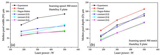 As shown in Figure 6a, the molten pool depth varied significantly with laser reflectivity. The molten pool depth of the Fresnel and Hagan–Ruben models corresponded to that of a constant reflectivity of 0.6 and did not agree with that of the experiments. For a constant reflectivity of 0.4, the molten pool depth obtained from the simulation was in good agreement with that obtained from the experiments. Ren et al. evaluated the time evolution of the reflectivity (absorptivity) using multiphysics CFD simulation [31]. They reported that the laser reflectivity varied depending on the laser condition, and the laser reflectivity of the Fresnel model was greater than that of the Hagan–Ruben model. Trapp et al. reported that the reflectivity varied between 0.2 and 0.7 for 316L stainless steel from the experimental measurements using a micro-calorimetry apparatus [50]. They performed experiments by varying the laser power at scanning speeds of 500 and 1500 mm/s. For the laser power range comparable to this study (between 180 and 500 W), the estimated laser reflectivity was about 0.23 for 500 mm/s and between 0.45 and 0.55 for 1500 mm/s [50]. The simulations with a constant reflectivity of 0.4 at 900 mm/s reproduced the experimental molten pool width, which is consistent with the trend in the experimental measurements of Trapp et al. It should be noted that the measured reflectivity was for the molten metal, i.e., the reflectivity when the temperature was greater than the solidus temperature. According to Xie et al. [51], the laser reflectivity at room temperature is greater than that at the melting temperature level for some pure metals and alloys. If the constant reflectivity of 0.4 is used at any temperature, the laser reflectivity for a temperature greater than room temperature may be underestimated.