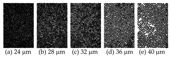 Figure 9 shows top views obtained from the powder spreading simulations with different . A sparse packing structure was observed at a of 36 or 40 m. To the best of the authors’ knowledge, in practical applications of L-PBF systems, the thickness of the powder bed region is often set to a length slightly larger than the . This indicates that the powder bed formed in the real L-PBF process will have sparse and inhomogeneous packing. Such packing inhomogeneity may lead to scanning track irregularity, which can cause defect formation. It should be noted that a sparse packing structure has been observed in powder spreading model experiments in previous studies, for example, in [52].
