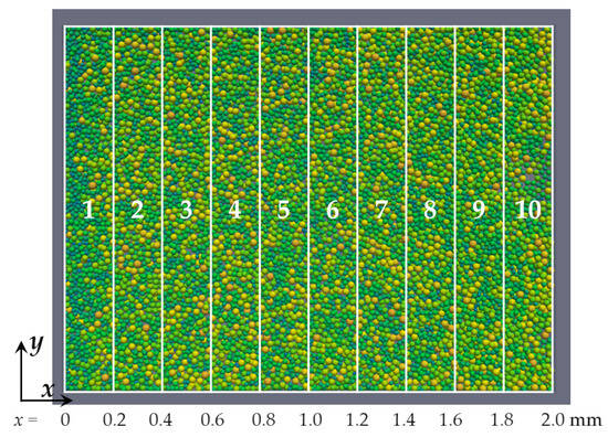Figure 10 shows a top view obtained from the powder spreading simulation with a of 24 m. To evaluate the packing homogeneity, the model domain was divided into ten subdomains along the x direction. The average diameter and number of particles were then measured for each subdomain. Figure 11a,b show the average particle diameter and the number of particles in each subdomain, respectively. As shown in Figure 11a, the average particle diameter in subdomain-1 was slightly smaller than that in the other subdomains. Except for subdomain-1, the average diameters for the subdomains were almost equivalent.