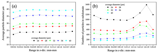 Figure 11b shows the number of particles in the ten subdomains. The number of particles was almost constant between 0 and 1.2 mm along the x direction; thereafter, it increased depending on the subdomain position along the x direction. This was likely due to the way the powder spreading simulation was performed. In the gravitational packing process, excess particles that did not fill the powder storage region flowed into the powder bed formation region before the coater movement, as shown in Figure 2c,d. Particles were deposited on top of this excess particle layer. As a result, the number of particles increased for 1.2 mm compared to 1.0 mm.