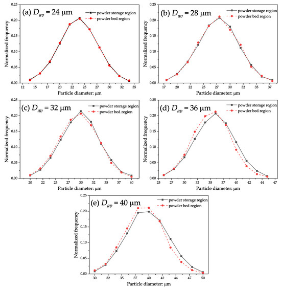 The particle size distributions at the powder storage region and powder bed formation region for = 24 m (a), 28 m (b), 32 m (c), 36 m (d), and 40 m (e).