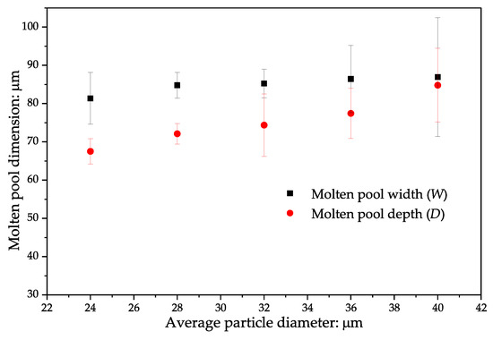 Relationship between the average particle diameter and molten pool dimensions, including the molten pool width (W) and depth (D). The points and error bars represent the averages and standard deviations for simulations conducted using the five different tracks shown in Figure 3.