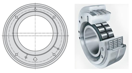 Due to the constant cost pressure on industrial companies, new approaches for saving energy and material by extending the geometric spectrum of ring rolling have been researched in recent years (cf., e.g., [,]). Here, the idea of rolling non-axially symmetrical rings opens up a new possibility for saving material and energy costs. Eccentric rings could be used, e.g., in triple-ring eccentric bearings (cf. Figure 1). The material savings to be achieved and, thus, the energy savings depend on the difference between the thickest and thinnest wall thickness.