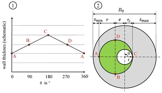 Qualitative wall thickness profile in circumferential direction (1); conceptualized eccentric ring (2).