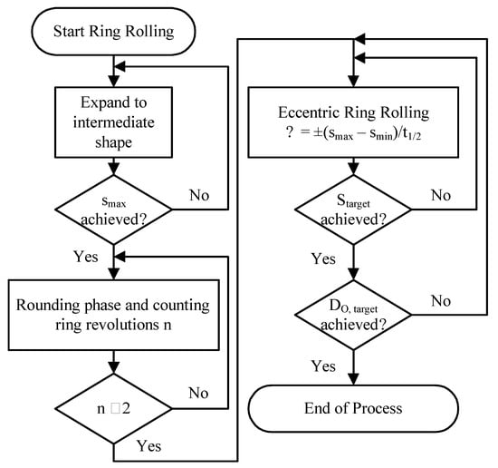In the first step, the hot steel ring is rolled up to an intermediate concentric shape within an expanding phase. This has the thickest wall thickness of the eccentric rings target geometry along the entire circumference. Subsequently, the ring is rounded by a stationary mandrel for approximately two ring revolutions. After that, the eccentric ring rolling process follows (cf. flow chart in Figure 5). During the first half-ring revolution, the mandrel moves toward the main roll. During the second half-ring revolution, the mandrel’s direction is reversed, moving it away from the main roll. It results in the wall thickness being progressively reduced by the mandrel’s infeed during the first half-ring revolution and decreasing in the second half-ring revolution. Consequently, an approximately mirrored wall thickness profile is achieved for the ring. An exact mirroring is not achieved because the infeed constantly increases the ring diameter and, thus, the half-ring rotation time , as well as the translatory velocity of the mandrel. Thus, the mandrel moves between and within one complete ring revolution, while the height is kept constant using the axial rolls. To achieve an increased eccentricity, the minimum wall thickness is reduced with each ring revolution until the desired target minimum wall thickness is reached. Assuming the rotation velocity of the ring remains nearly constant, the velocity of the mandrel needs to be increased accordingly to cover the increasing distance. Once the desired minimum wall thickness and outside diameter are reached, the process is completed.