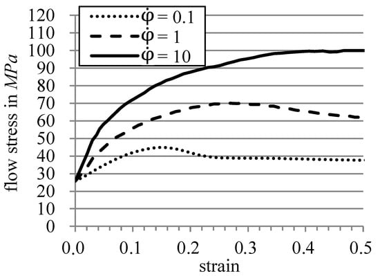 Flow curves for the ring were generated by isothermal, frictionless, single-step compression tests for temperatures of 950–1200 °C in 50 °C steps and constant strain rates of 0.1 s−1, 1 s−1 and 10 s−1 at each temperature. For example, Figure 7 shows the flow curves at 1150 °C for all the strain rates. The mean values of two tests were utilized for each parameter combination of the flow curves for simulations. In the FEA model, the flow curves are represented in tabular form and automatically linearly interpolated as needed. If strains exceed the highest tabular value, the flow stress is assumed to remain constant.