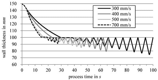 Wall thickness curves over time at main roll circumferential velocities of 300, 400, 500 and 700 mm/s.