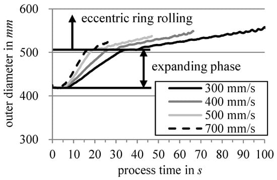 The different circumferential velocities of the main roll also influence the ring growth rate and, respectively, the change of the outer diameter over time (cf. Figure 9). This occurs because the circumferential velocity of the main roll increases the individual pass reductions on the ring, thereby increasing the single-ring growth rate. However, this can lead to a standstill of the ring in the ring rolling mill if the pass-through condition during rolling is undercut. Therefore, when reducing the main rolling velocity, it could also be necessary to reduce the ring growth rate in the expanding phase.