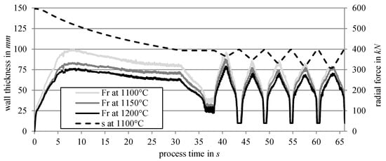 As already mentioned, forming conditions, such as the ring temperature, have an influence on the achievable eccentricity during eccentric ring rolling, as these affect the forming force in the roll gaps. The forming force in the radial direction (short: radial force ) limits the translatory feeding of the mandrel and consequently restricts the maximum achievable eccentricity. depends on the geometry of the main roll and mandrel. These relations have already been described in past works such as [,]. The radial force can be determined approximately as a function of the mean projection of the contact area on the rolling plane and the resistance of forming , i.e., . Furthermore, depends on the specific process and can be determined using the flow stress []. However, of the rolled material can be influenced by varying the ring temperature. Increasing process temperatures lead to a decrease in , resulting in higher forming of the rolled ring when the plant limits are reached. Accordingly, Figure 10 shows the forming force for an eccentric ring rolling process in the radial gap at rolling temperatures of 1100 °C, 1150 °C and 1200 °C, with a main roll circumferential velocity of 300 mm/s from FEA simulations. The temperature curves at 1100 °C, 1150 °C and 1200 °C are shown in Figure 10. For orientation, the wall thickness curve at 1100 °C is also provided. As expected, decreases with higher ring temperatures. Thus, when the force limits of the ring mill are reached, the ring temperature can be increased to reduce the required forming forces. For this reason, the maximum furnace temperature of 1226 °C was set for experimental tests. Considering the transition time of the hot ring from the oven to the ring rolling mill, the ring should have a temperature of 1200 °C.