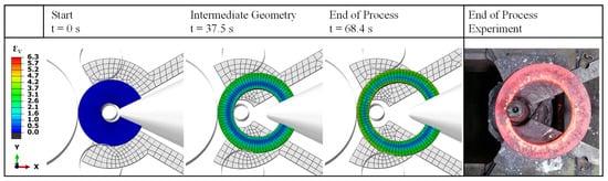 The eccentric ring rolling strategy, determined and optimized with FEA simulations, was implemented on the rolling mill using the technology module. The process parameters, determined with FEA simulations, were also implemented on the IBF ring mill to achieve the highest possible eccentricity. Figure 11 shows the evolution of the ring geometry over the process for different states, where represents the equivalent strain. Additionally, the results of experiments conducted at the IBF ring rolling mill are presented. Table 6 provides the final geometries obtained from FEA simulation and experiments. To demonstrate the reproducibility of the process, the experiment was repeated five times. The deviation in is a result of the summation of the deviations and scaling loss.