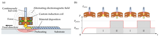 (a) Principle of the wire induction additive manufacturing process approach. (b) Pulsed generator power curve for forced droplet detachment with base power phase (I) and pulse power phase (II) [33].