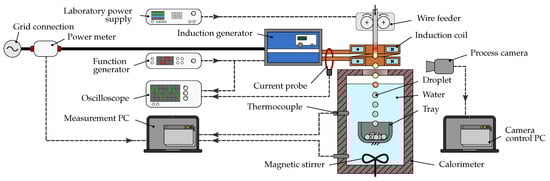 In terms of efficiency, the process seems to fall short of expectations, while the overall efficiency of induction heating is generally considered relatively high compared to other heating processes, even an induction coil, as used here, which heats in the inner field, has a better inductor efficiency than, for example, a surface inductor that acts through its outer field [11,40,41]. However, the calculated overall efficiency, considering the power consumption to thermal power in the droplets across all experiments, is only between 9 and 14%. As previously explicated, given that the ascertained droplet temperature is expected to be lower than the actual value, it follows that the derived efficiency is somewhat diminished compared to the real magnitude. A possible reason for the lower efficiency could be a hardware-related suboptimal matching of the resonant circuit to the load on the generator side. This would already reduce the efficiency within the induction generator and consequently worsen the overall efficiency of the system, despite a good coupling from coil to wire. Therefore, future investigations will include an additional power measurement directly at the induction coil to better contextualize these results.