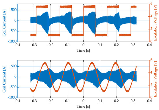 In comparing the excitation voltage of the function generator to the resulting coil current, it is evident that the system of the induction generator and the resonant circuit system exhibits a sluggish response at the chosen pulse frequencies of between 7 and 14 Hz, preventing it from reproducing the input signal even remotely. The damping present in the oscillating circuit of the induction generator, coupled with its internal circuit topology, causes the current measured in the induction coil to lag behind the input signal. This behavior is observed for both the rectangular and sinusoidal excitation voltages, as depicted in Figure 3 for a frequency of 7 Hz.
