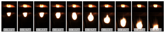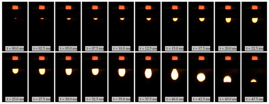 The experiments with a constant power, however, demonstrated that uniform droplet detachment can occur even without power pulsation. The detachment frequency increases with an increasing generator power up to a certain power level, denoted as (approximately 65% in these experiments). For < , lower droplet detachment frequencies are observed compared to = . Beyond this critical point, increasing the generator power > no longer leads to an increase in the detachment frequency. However, the detachment process becomes more turbulent, and the molten flow intensifies. Since the detachment frequency remains constant, the residence time of the droplets at the wire end is the same as at the lower power level . Consequently, they experience increased heating, resulting in a comparatively higher temperature at the moment of detachment. This is recognizable by the brighter glow of the droplets. An exemplary droplet detachment for > is depicted in Figure 6. The droplet size and the detachment process itself are comparable to those described earlier in Figure 5.