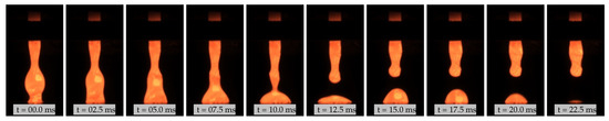 Figure 5 exemplifies a sequence of images corresponding to a favorable set of parameters (60–70% generator power, 7 Hz pulse frequency), wherein a regular and uniform droplet detachment is observed. The moments of droplet detachment exhibit temporal scattering of less than 10 ms. Furthermore, the observed droplet sizes appear consistent, although their assessment is somewhat limited due to the low dynamic range in the capture area and the reduced resolution resulting from the close focusing distance of the installed lens and the necessary cropping. The location at which the molten wire end is constricted and the droplets detach is approximately at the height of the lower coil winding. At this generator power level, the droplet detachment frequency is 14 Hz.