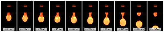 Figure 7 displays the sequence of images from an experiment with pulsed generator power where the average power theoretically lies at = . However, due to the previously described inertia of the generator, it practically falls below . As a result, a substantially lower droplet detachment frequency of approximately 2 Hz and an irregular melting behavior are observed. The temporal scattering of the detachments at around 300 ms is significantly higher than in the previously described case, indicating that the droplet formation is comparatively more stochastic. Due to the lower power level, the region where the wire constricts and the droplet detaches is located well below the induction coil, likely triggered primarily by the gravitational force of the droplet. The energy supplied to the continuously fed wire is not sufficient to fully melt and detach it within the induction coil. Furthermore, the comparatively weaker luminosity of the droplets suggests that a lower droplet temperature is present compared to those shown in Figure 5 and Figure 6. Overall, the detachment process is more random, with the free end of the wire pinching at two points, and the molten droplets exhibiting more movement. It is conceivable that in this case, the power pulsation may have a rather adverse effect on the regularity. Figure 8 shows a sequence of images depicting a slow droplet formation and detachment at < . Although the material of the fed wire can be melted, the power is insufficient for rapid detachment. As a consequence, large-volume droplets form and detach from the wire end only at a late stage and below the induction coil. The droplet detachment frequency at this generator power level is 4.7 Hz. Compared to the droplets in Figure 7, it can be assumed that there is a higher temperature and thus a higher average power. There is only one point of constriction, and the temporal spread of detachments is less than 30 ms, thus significantly lower.