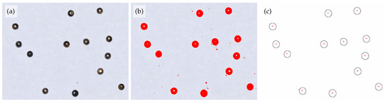 (a) Cropped image of the photographed drops (60–70% generator power, 7 Hz pulse frequency). (b) Image adjusted with a threshold value. (c) Automated filtering, counting, and size measurement using ImageJ.