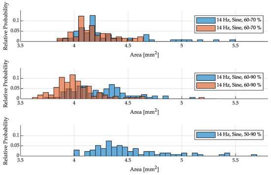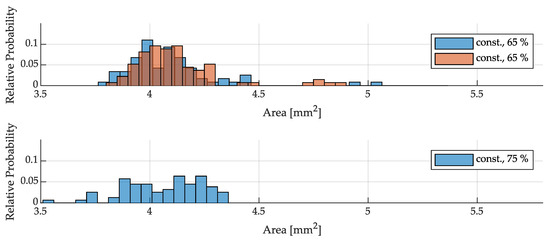In Figure 10, the size distribution during operation with constant power is depicted. In comparison, Figure 11 and Figure 12 illustrate the size distribution of droplets under pulsed power conditions between 7 and 14 Hz, respectively. The size analysis of the droplets shows that their projected area is generally between 3.5 and 5.5 mm2. Based on the assumption of spherical geometry, this corresponds to droplet diameters between 2.11 and 2.65 mm and indicates that the deviation of the actual absolute droplet size is relatively small. When comparing the experiments conducted at a constant power, it is evident that at 65% power as opposed to 75%, a greater number of outliers are observed in the histogram, resulting in a wider spread. These outliers predominantly consist of larger droplets exceeding the average size. With a higher power, the droplets tend to exhibit a slight reduction in size, which can be attributed to a marginally higher detachment frequency due to the constant wire feed rate. However, the data appear to display a relatively improved normal distribution at lower power settings.
